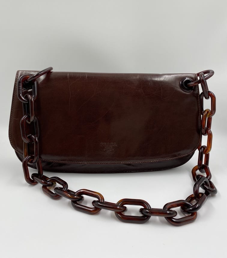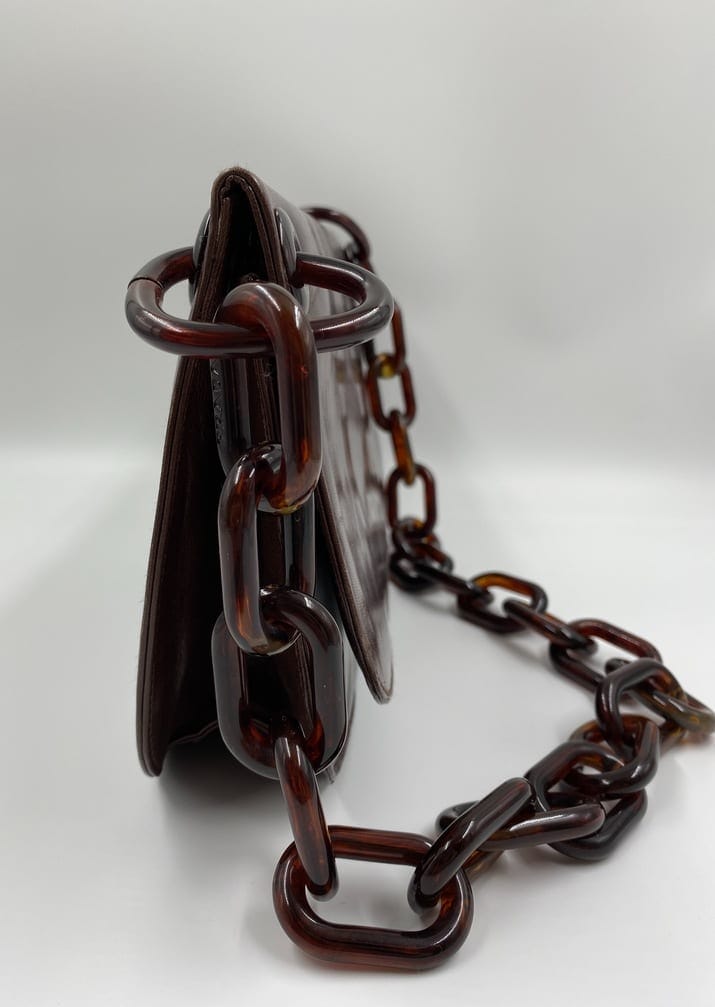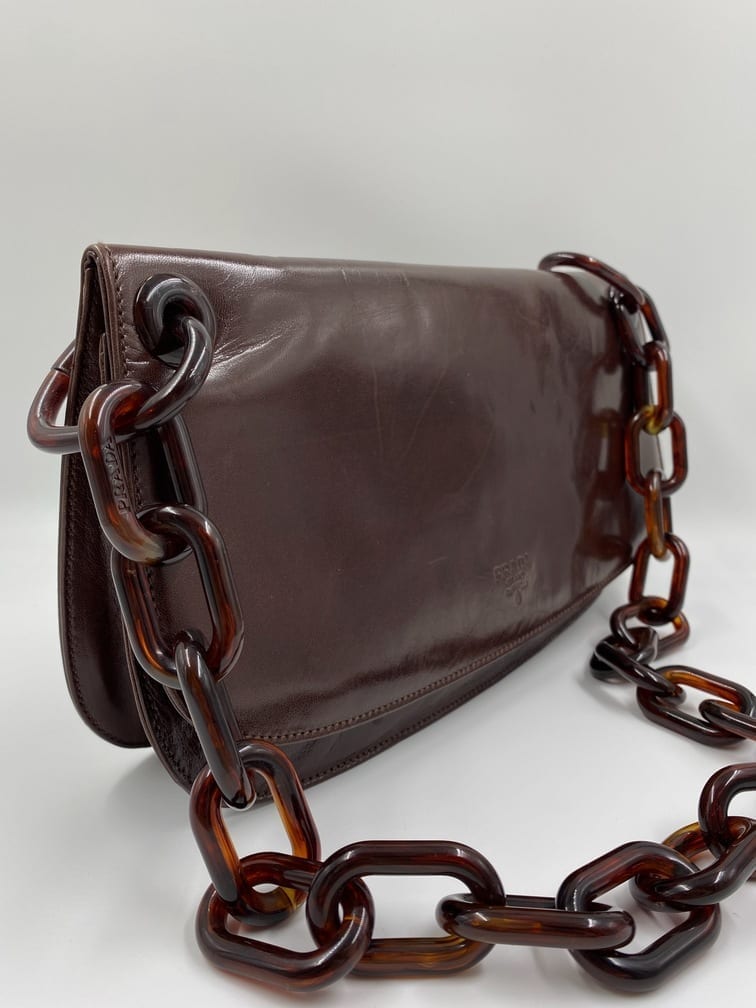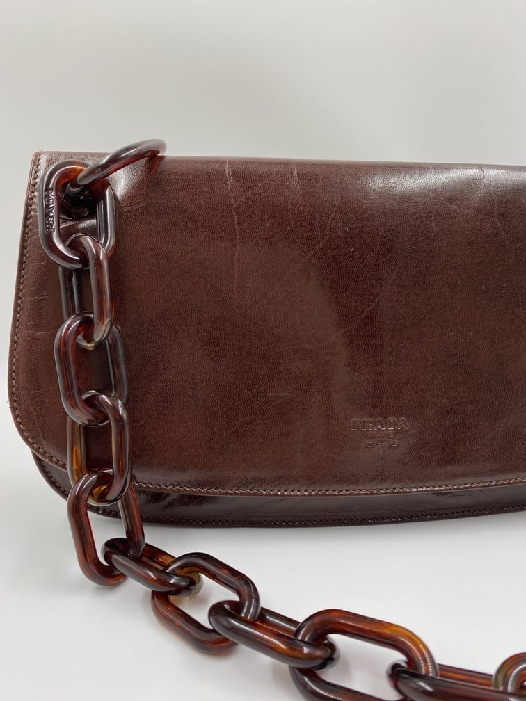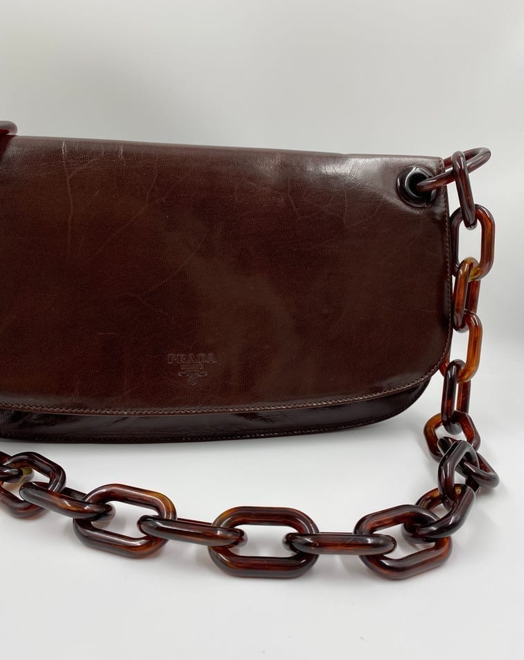 A very cool brown leather flap shoulder bag with perspex tortoise shell colour chunky chain handle, the main bag plus the chain handle is branded with the Prada logo. The bag is lined with the iconic Prada logo nylon lining. There is a zipped interior pocket for valuables.