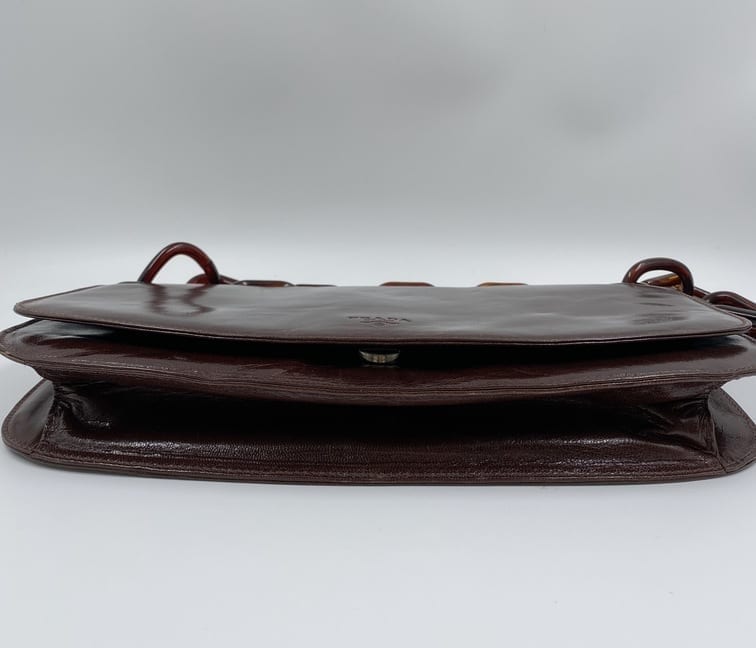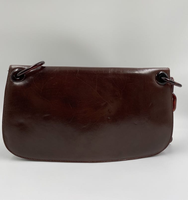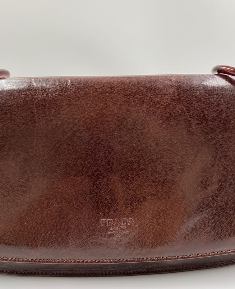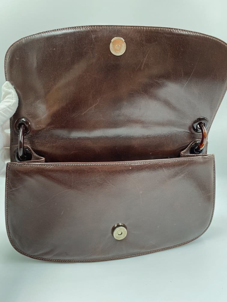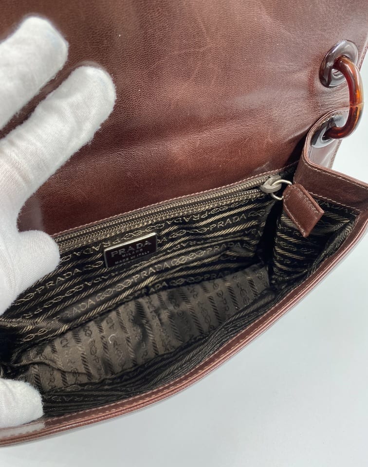A very cool brown leather flap shoulder bag with perspex tortoise shell colour chunky chain handle, the main bag plus the chain handle is branded with the Prada logo. The bag is lined with the iconic Prada logo nylon lining. There is a zipped interior pocket for valuables.