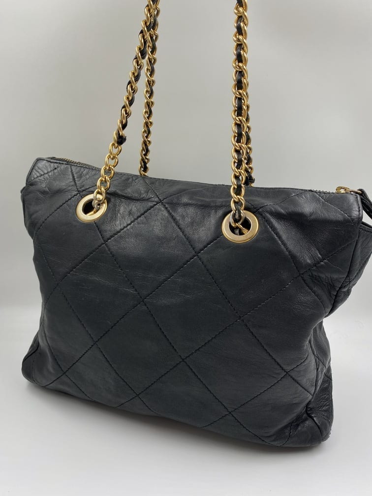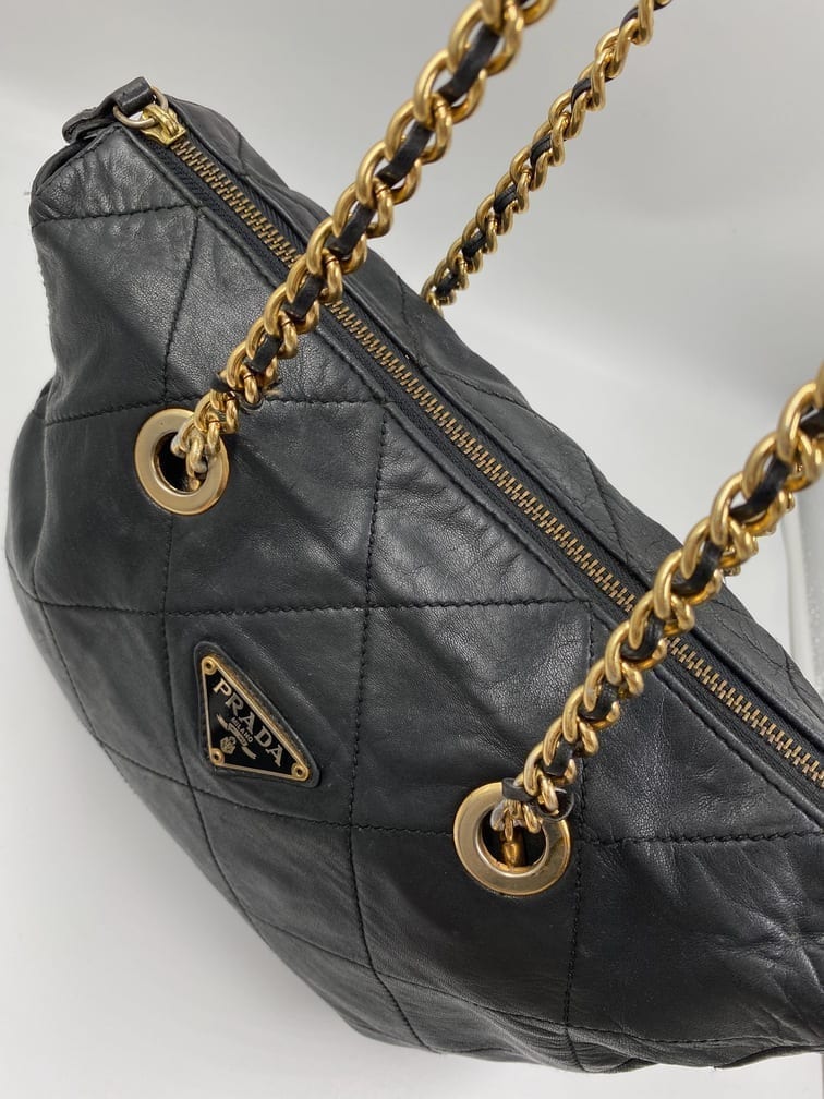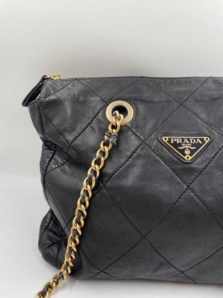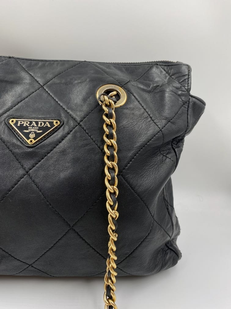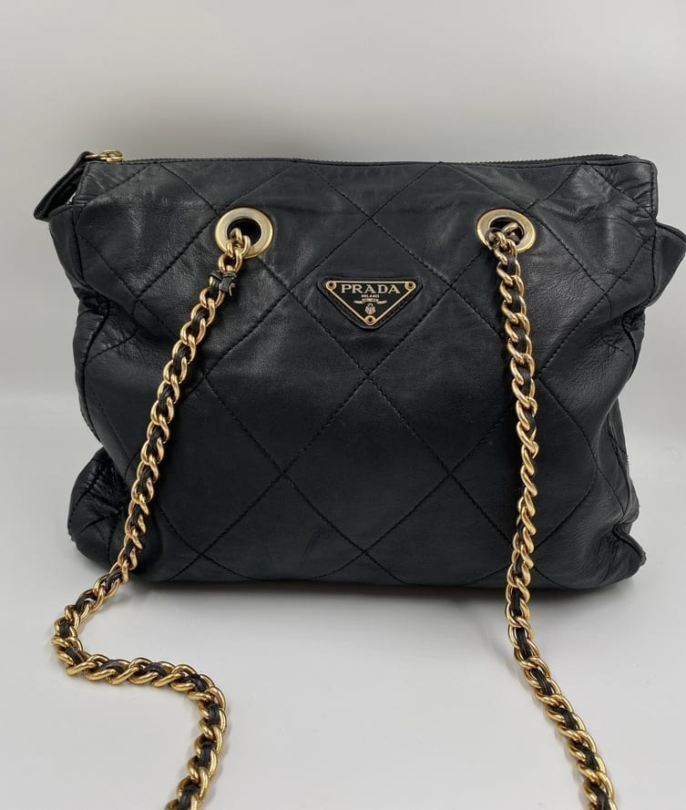 This sought after vintage leather Prada tote bag is the perfect 90’s accessory. Made from black quilted leather and gold hardware. On the front is the iconic Prada ceramic/metal plaque and inside the bag is lined with the Prada logo lining. There is an interior zipped pocket for valuables.