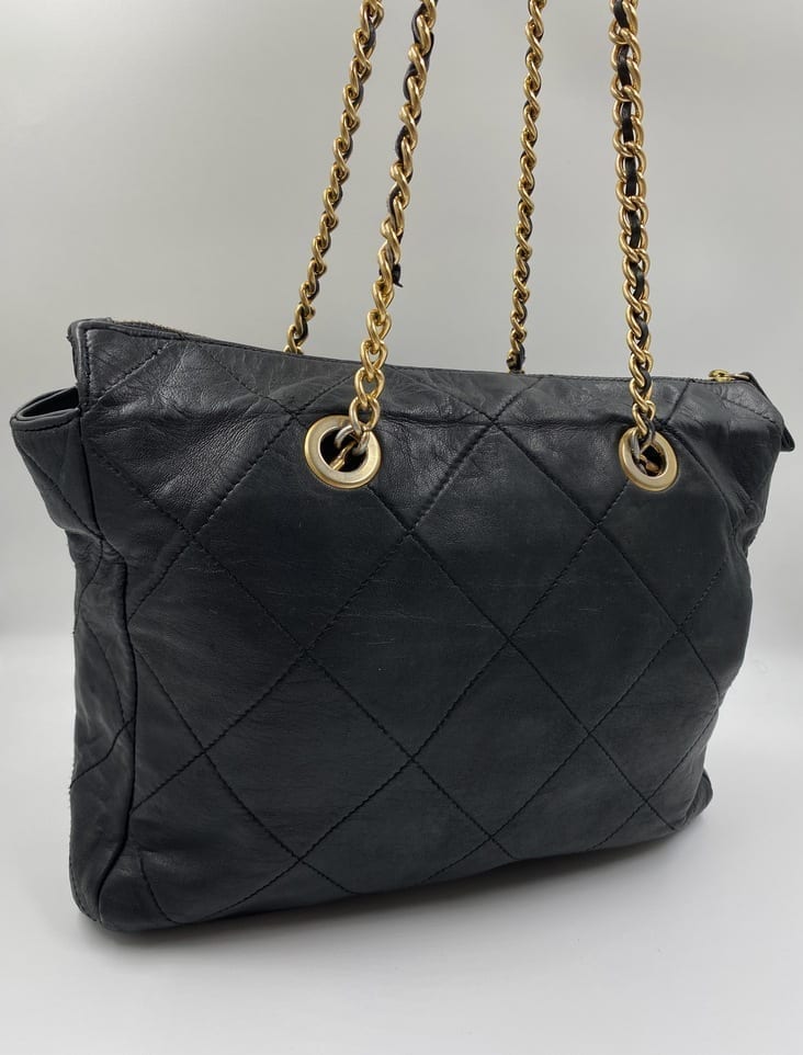 The bag is in good vintage condition, with some signs of wear. There are some slight scratches that can be seen on the leather and some colour fade and tarnishing on the metal hardware. The leather thread through the chain has started to come loose in some places. Please see all photos before buying. There are no rips or no stains inside or out.
