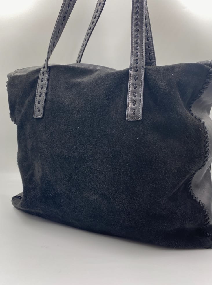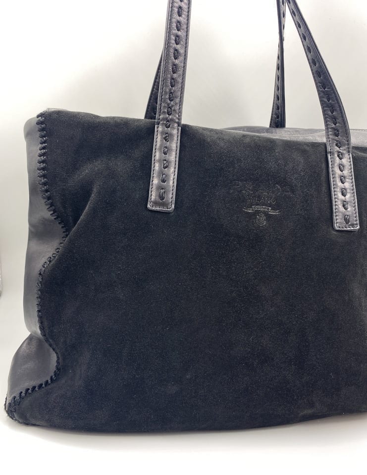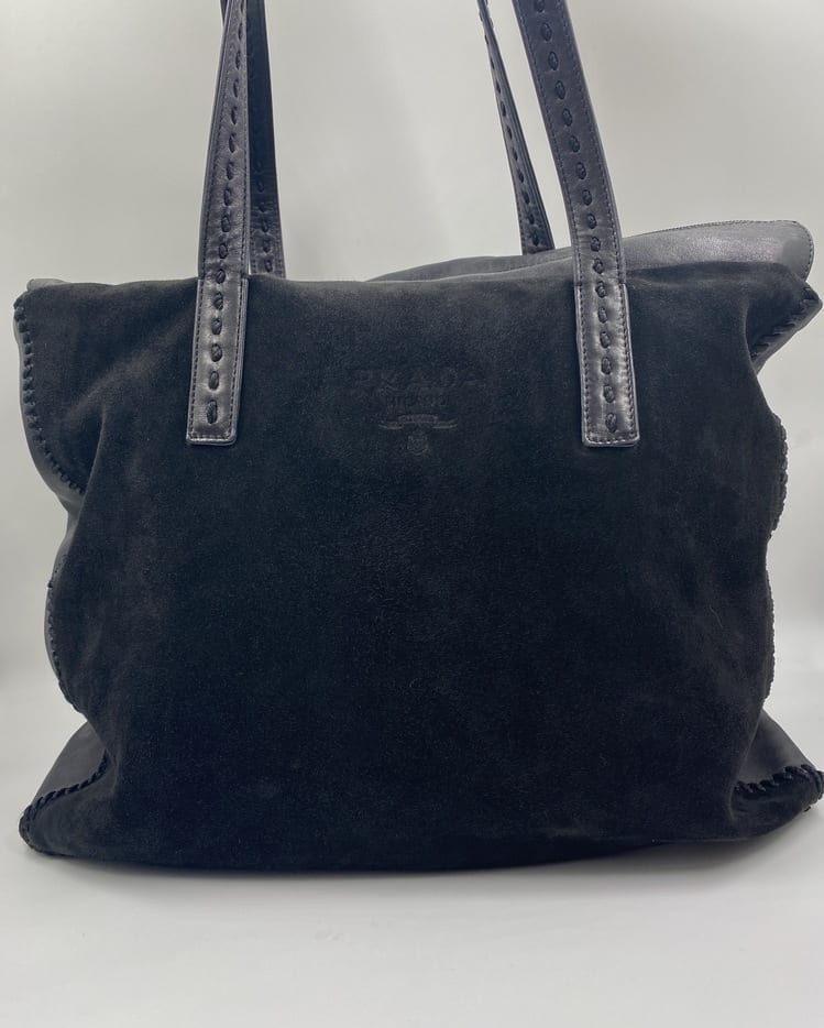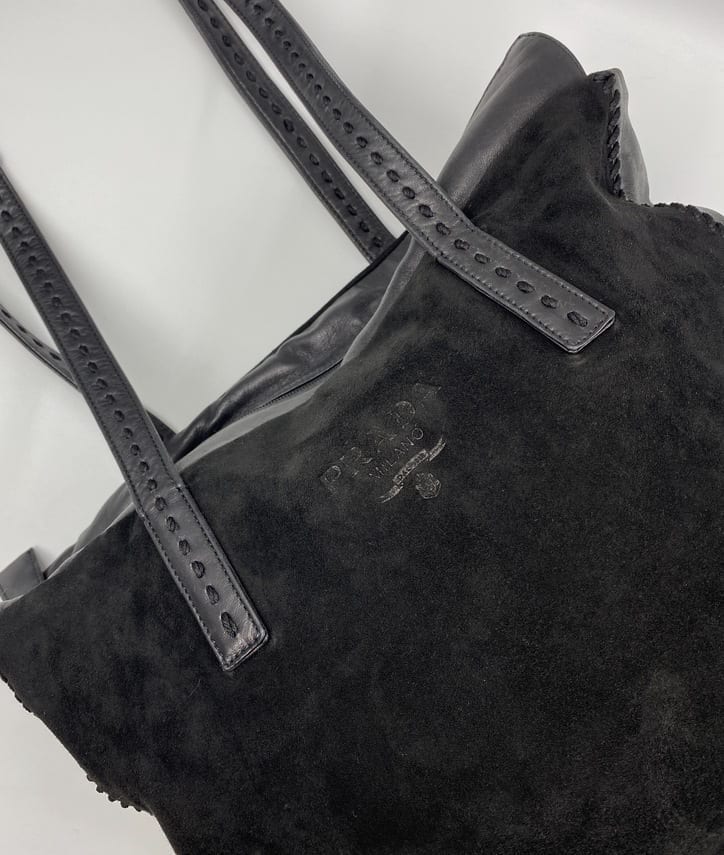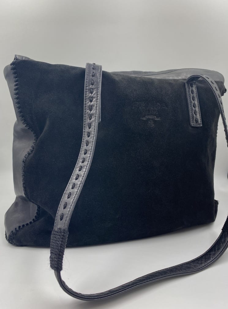 A lovely black slouchy leather and suede tote with whipstitch detail. The front and back panel are suede and the handles, base and sides are a soft buttery leather. The bag is fastened with a top zip and inside the bag is lined with the Prada logo nylon lining, plus there is a zipped pocket for valuables.