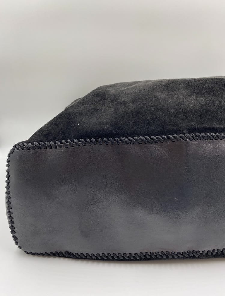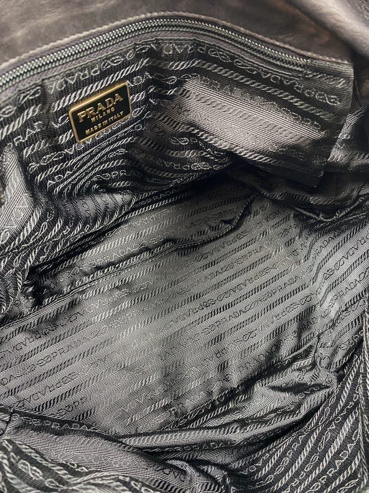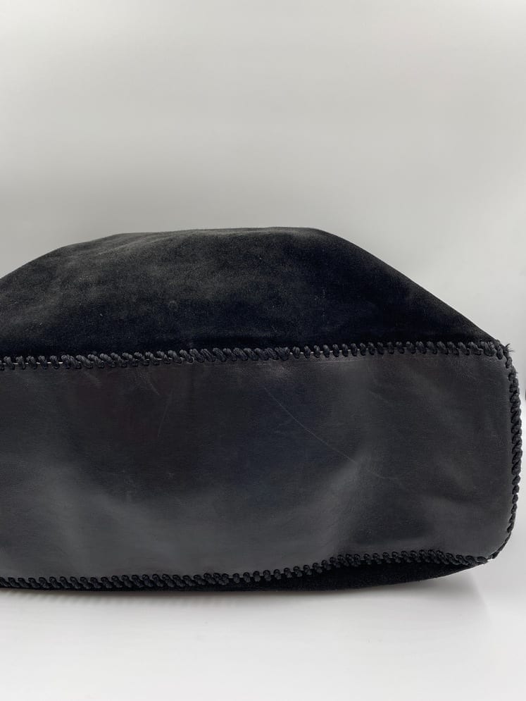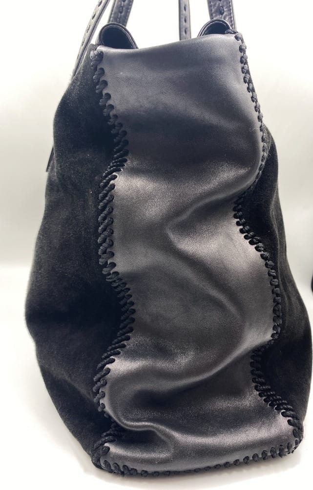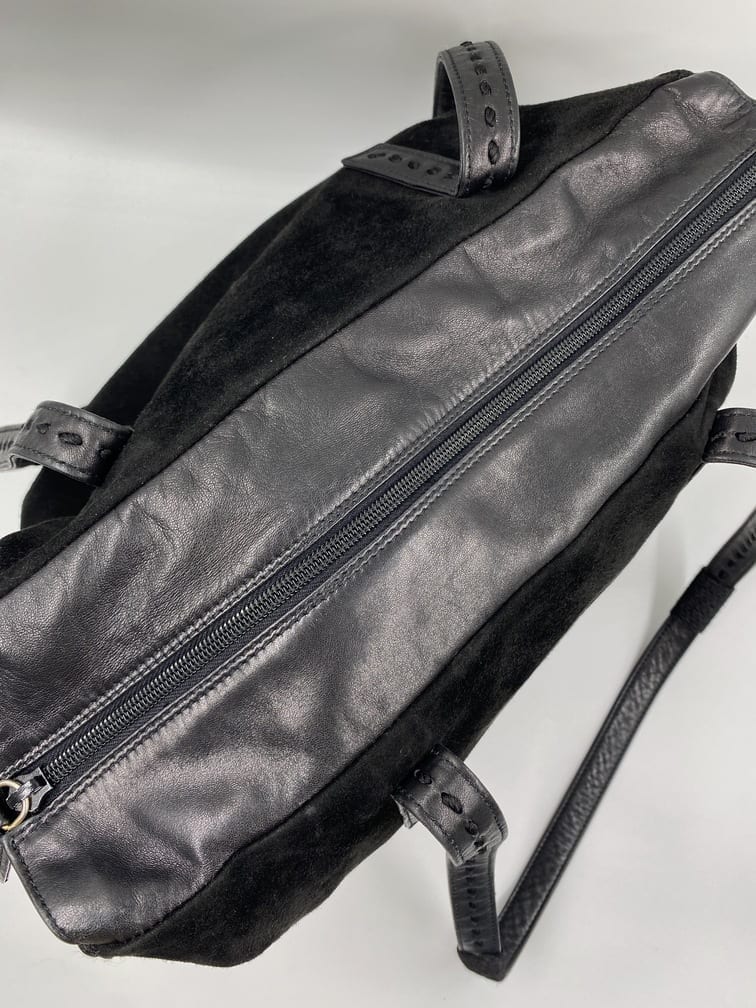 A lovely black slouchy leather and suede tote with whipstitch detail. The front and back panel are suede and the handles, base and sides are a soft buttery leather. The bag is fastened with a top zip and inside the bag is lined with the Prada logo nylon lining, plus there is a zipped pocket for valuables.