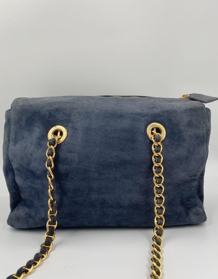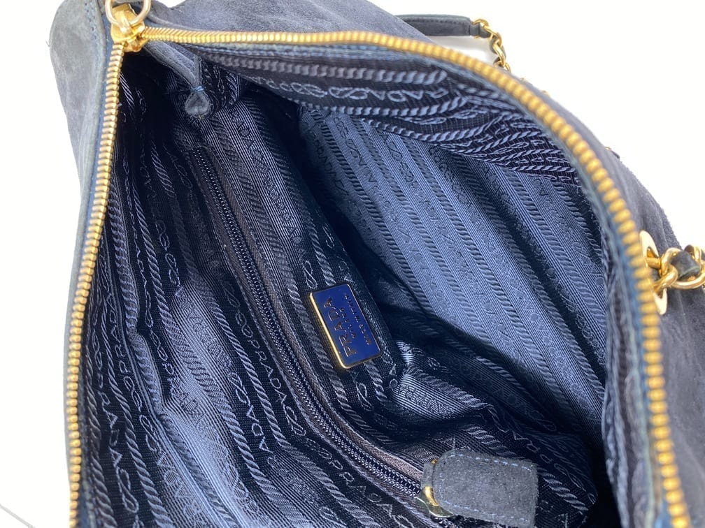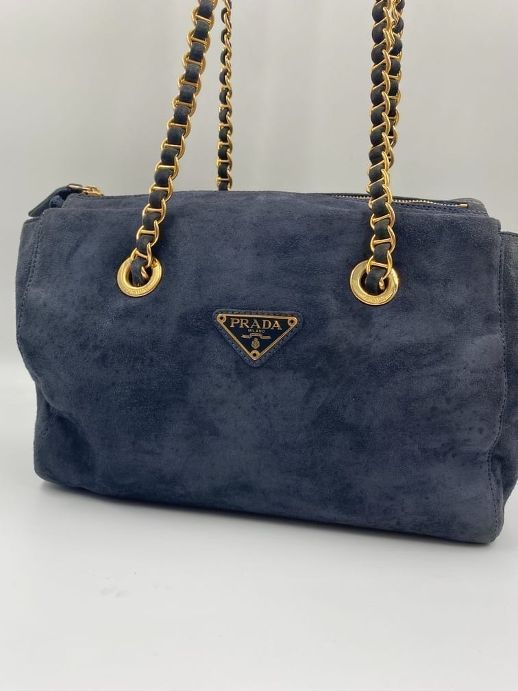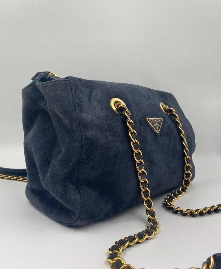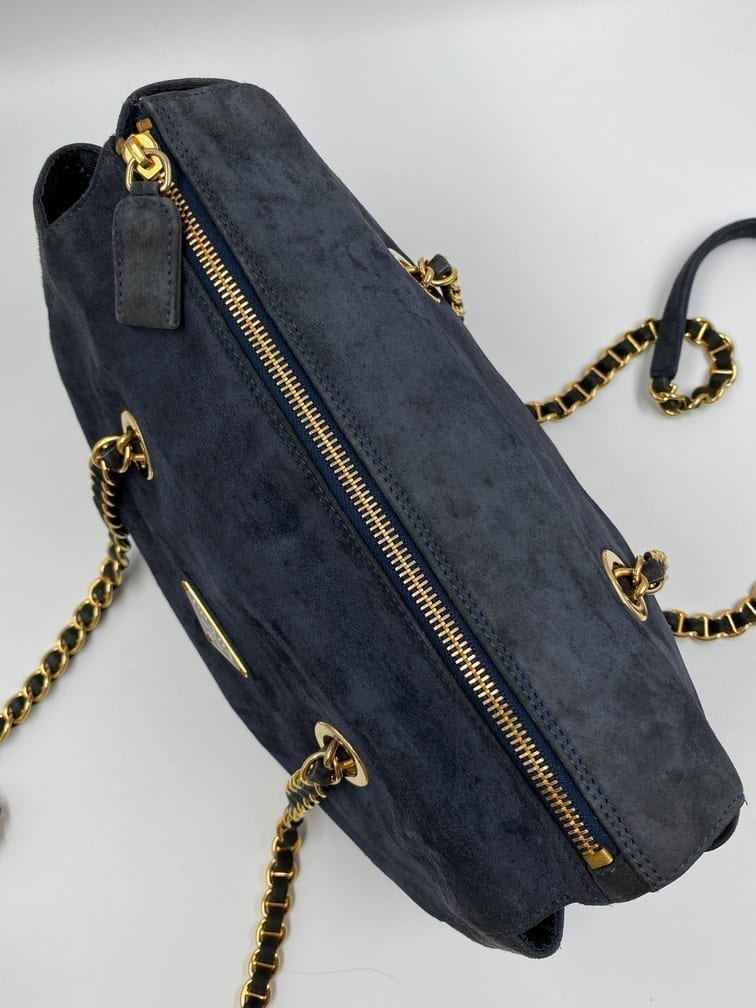 This sought after vintage suede Prada tote bag is a special find. Made from a dark blue/grey suede with Prada branded gold hardware and a double chain handle. On the front is the iconic Prada ceramic/metal plaque and inside the bag is lined with the Prada logo lining. There is an interior zipped pocket for valuables. Zips are IPI and the white factory label is present.