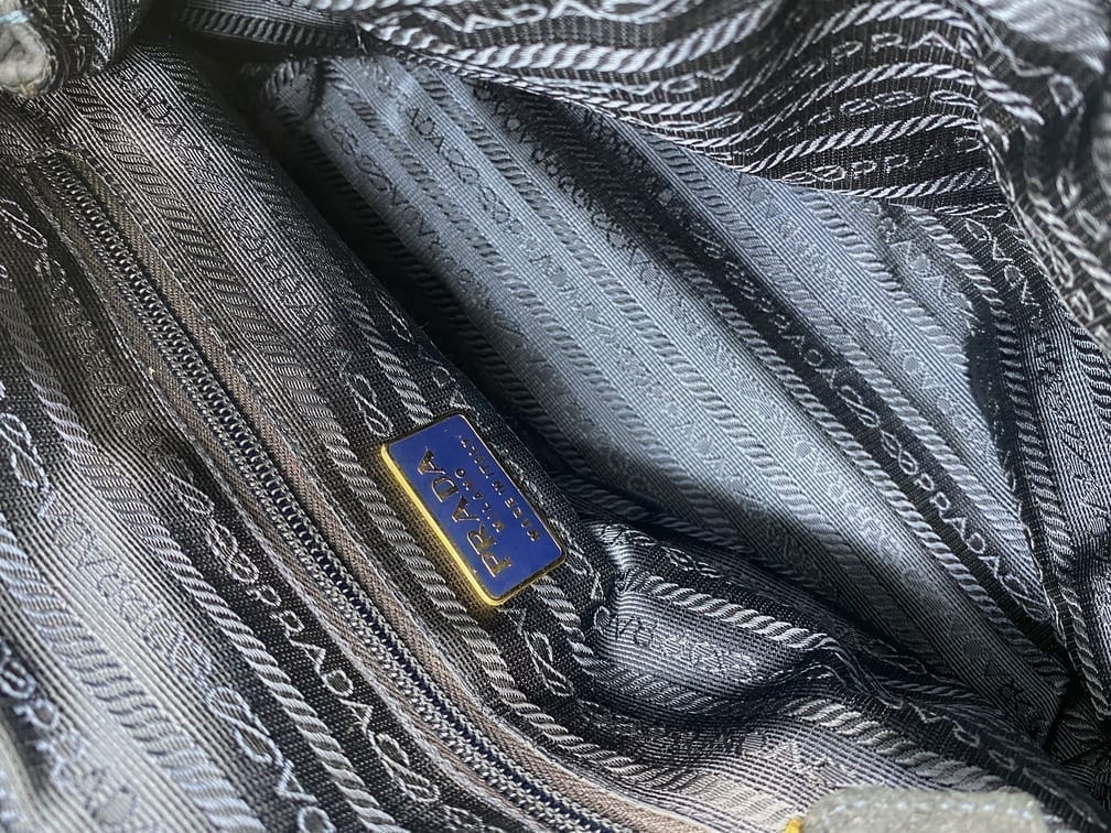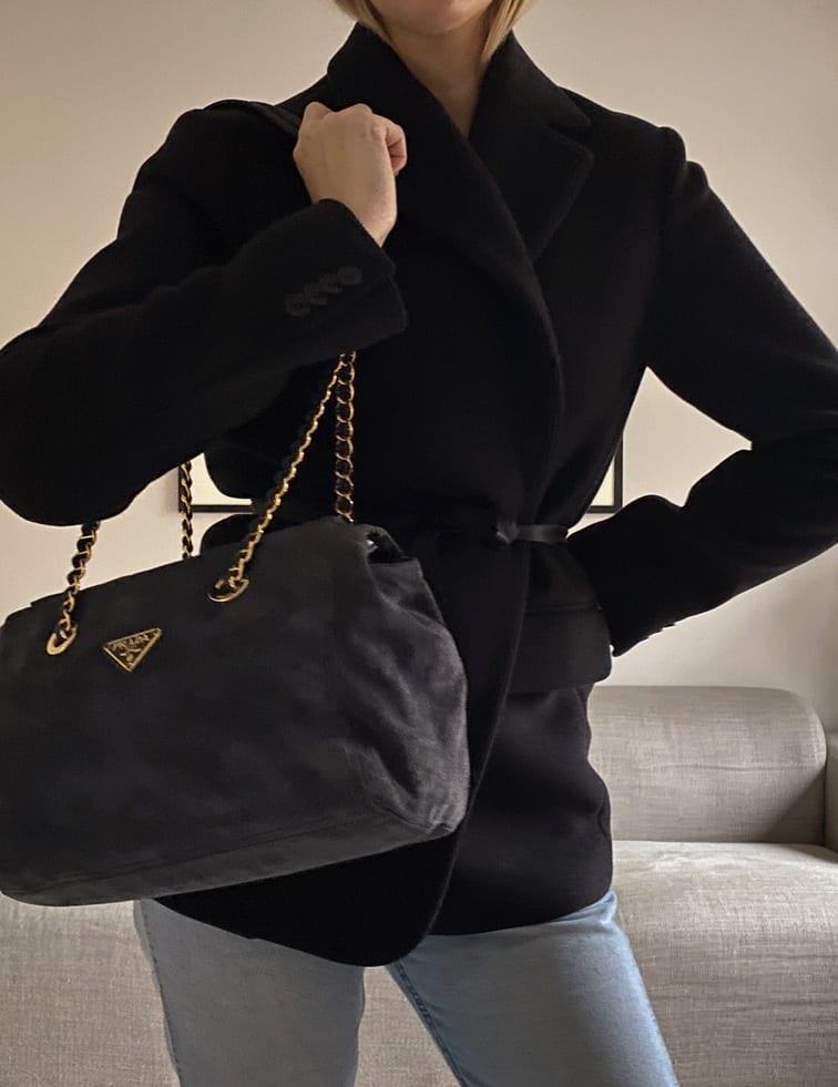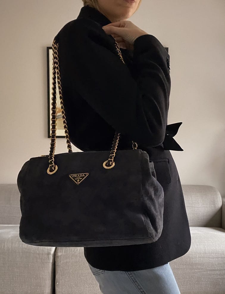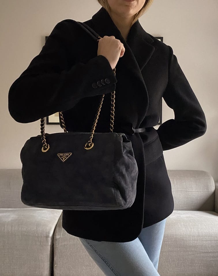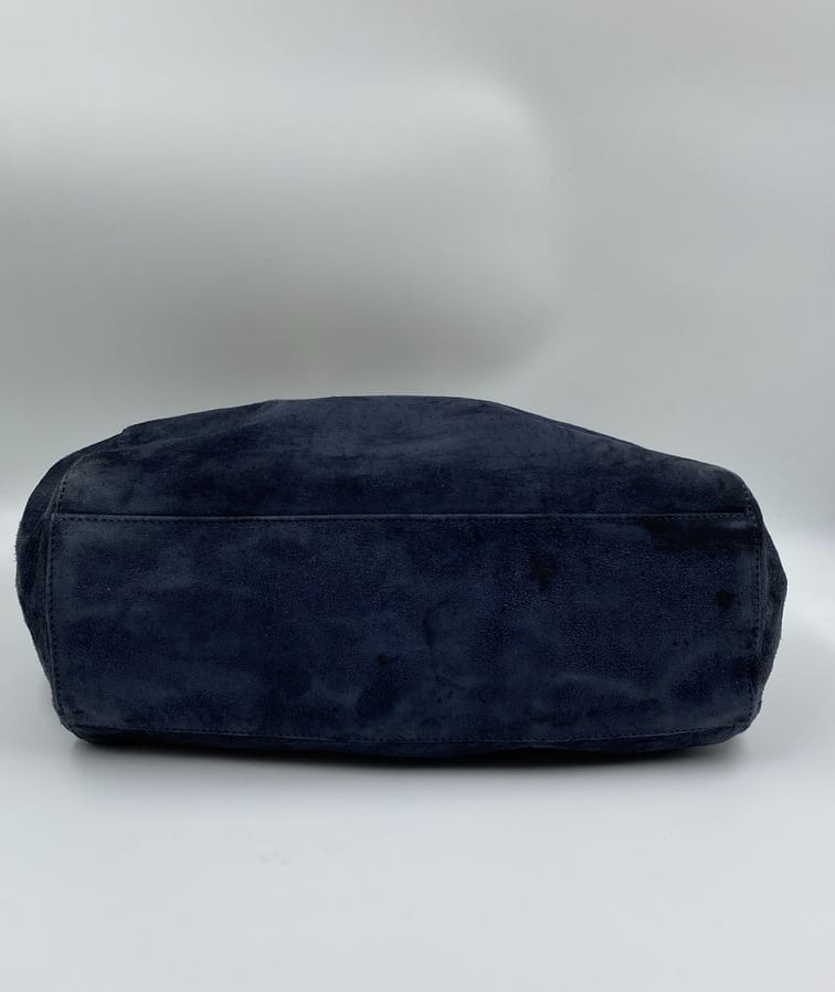 This sought after vintage suede Prada tote bag is a special find. Made from a dark blue/grey suede with Prada branded gold hardware and a double chain handle. On the front is the iconic Prada ceramic/metal plaque and inside the bag is lined with the Prada logo lining. There is an interior zipped pocket for valuables. Zips are IPI and the white factory label is present.