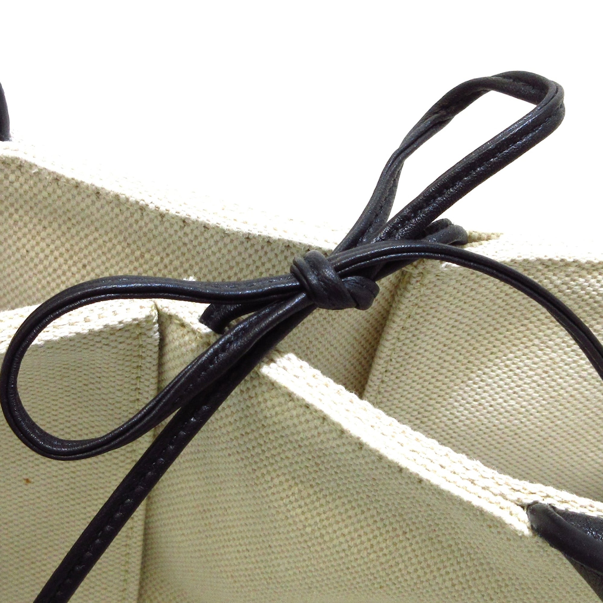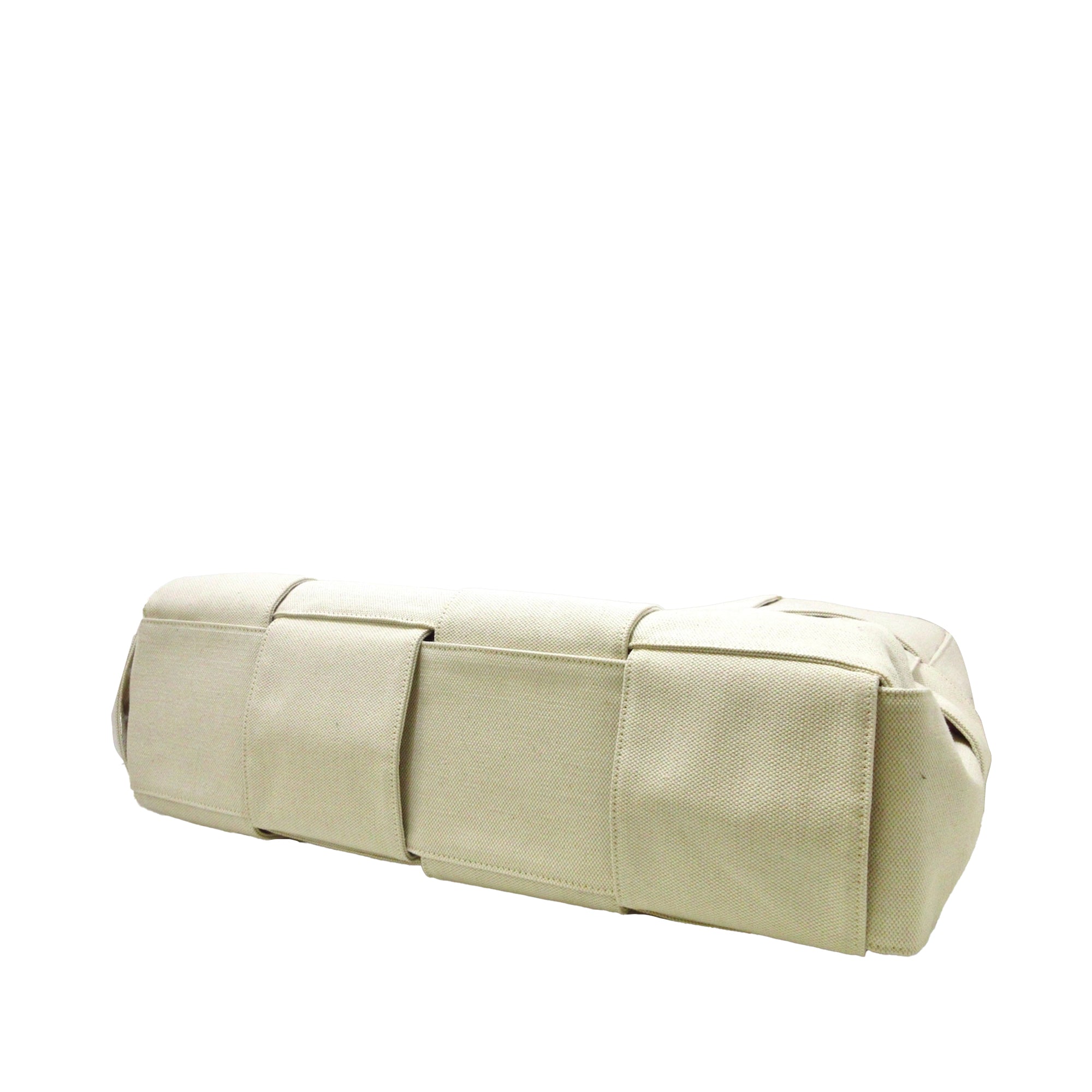 Product Details: White Bottega Veneta Maxi Canvas Intrecciato Arco Tote. The Intrecciato Arco features a canvas body, rolled leather handles and an open top with drawstring-tie closure. 9.4″ L x 15.4″ W x 5.1″ D, 6.7″ drop.
