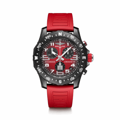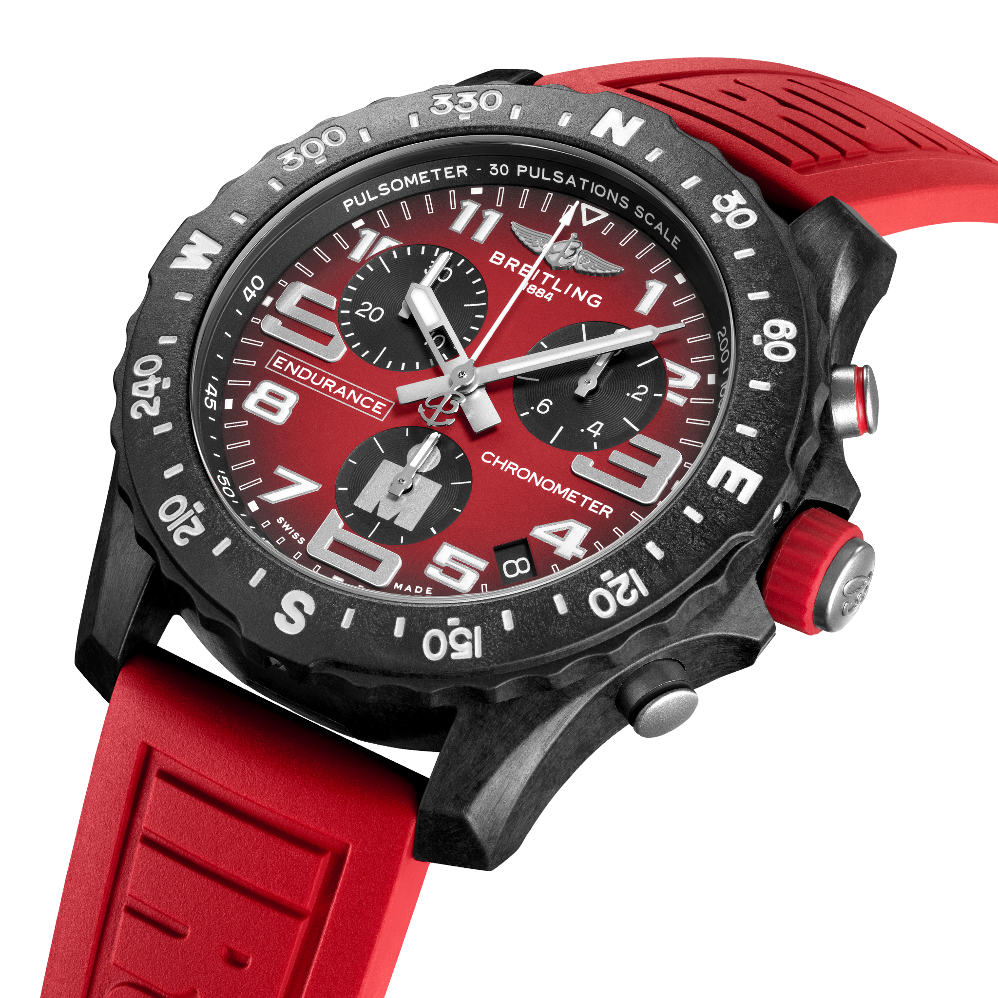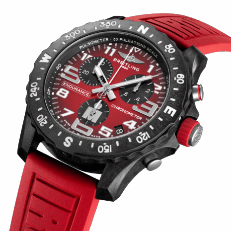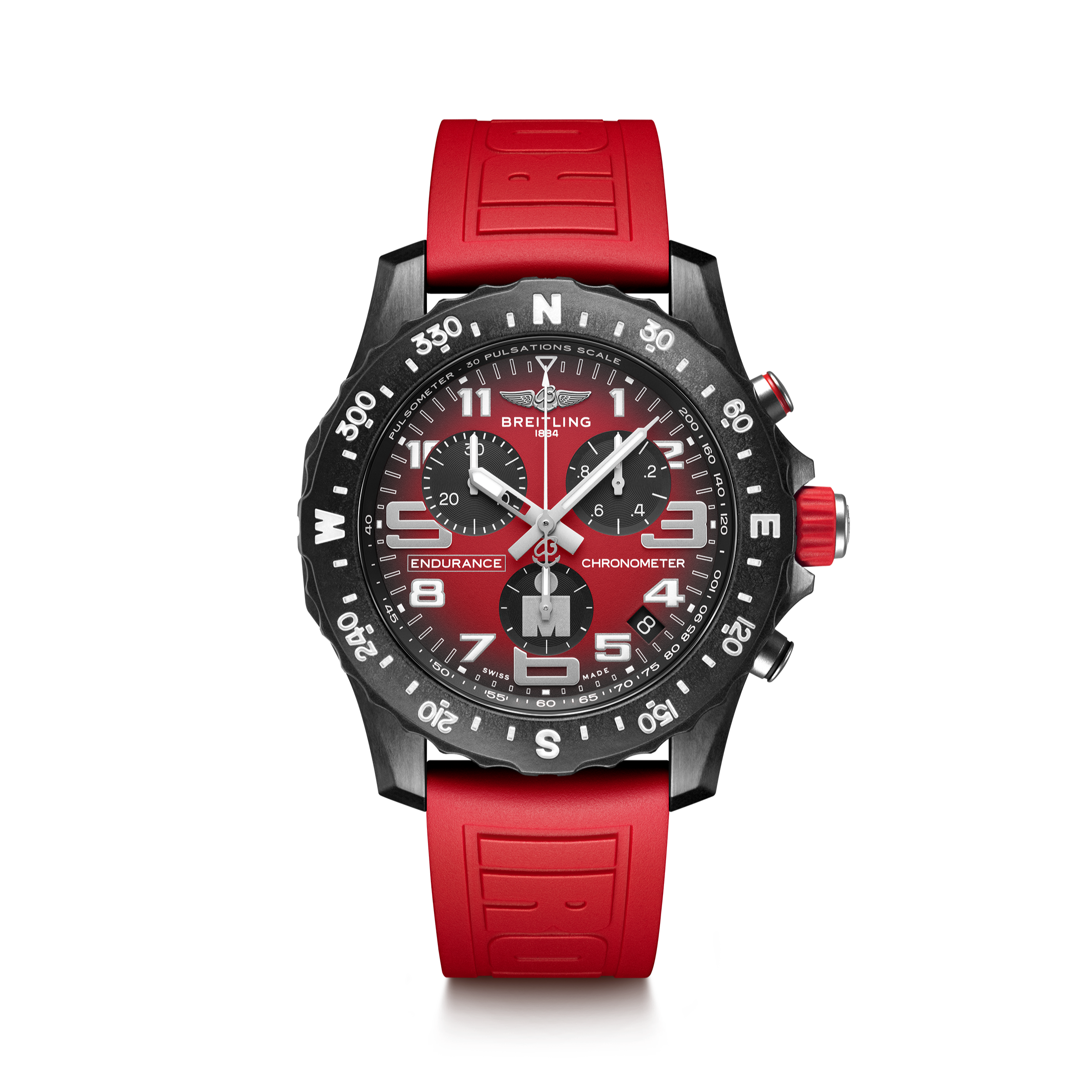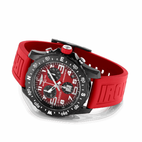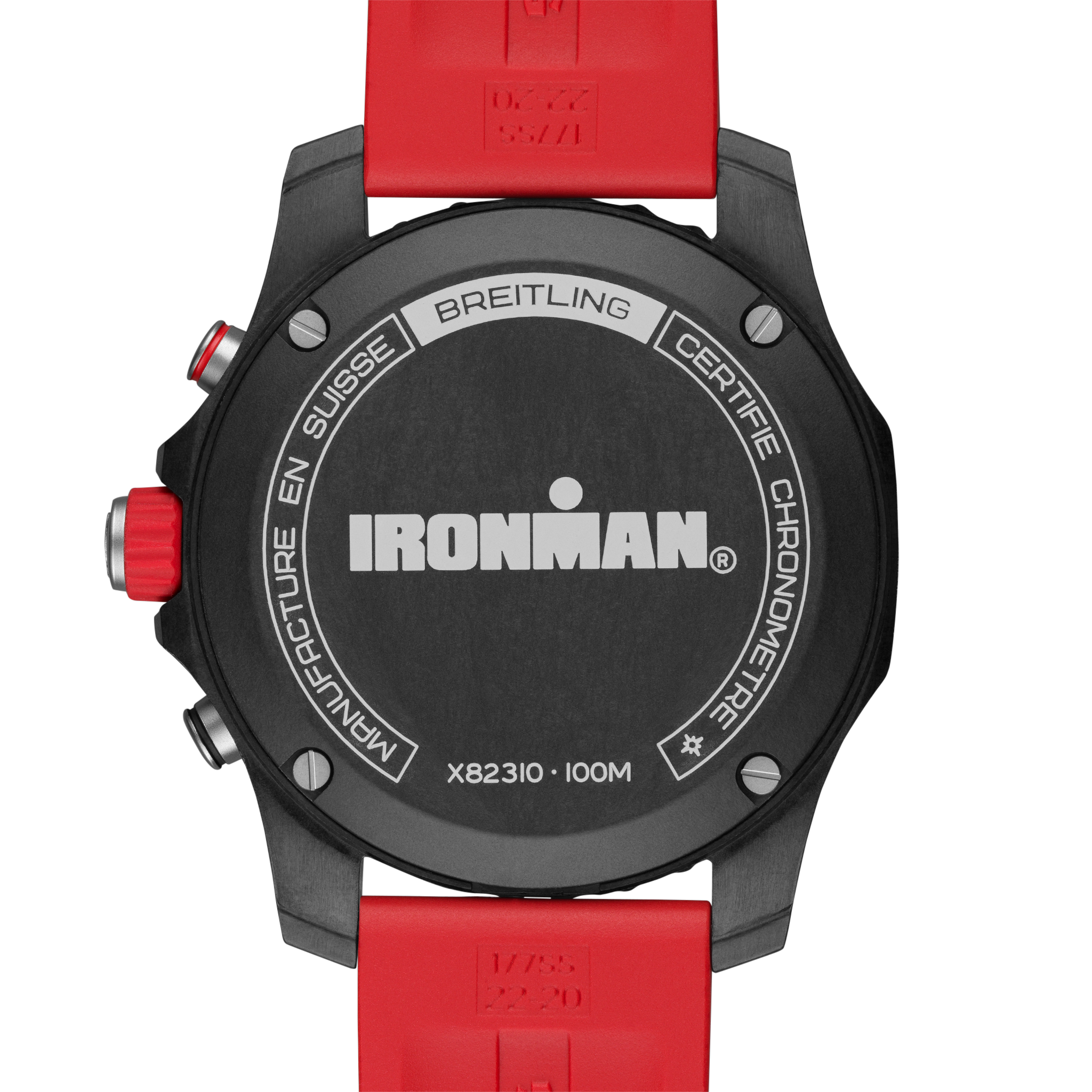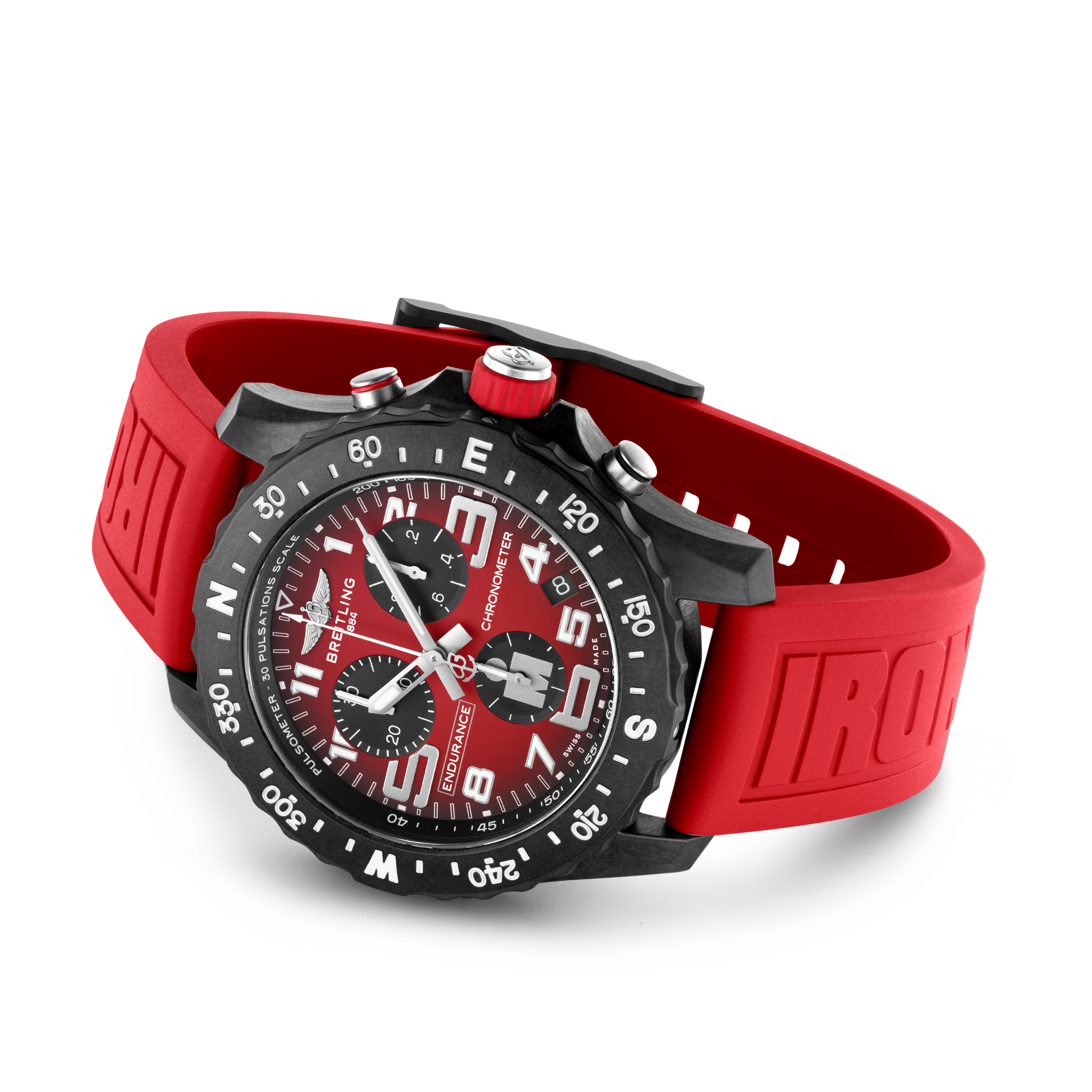 Breitling’s IRONMAN® edition lightweight Endurance Pro watch. Designed for men and women whose active lives blend a professional mindset with a sporty lifestyle, the Endurance Pro is equal to the challenges of a rigorous workout but fashionable enough for everyday wear. The Endurance Pro features an ultra-light Breitlight® case, a robust material 3.3 times lighter than titanium and 5.8 times lighter than stainless steel. Non-magnetic, thermally stable and hypoallergenic, Breitlight® is highly resistant to scratches, traction and corrosion. It also has a touch that is warmer than metal and a slightly textured effect accentuating the originality of the design. Exclusive to Breitling, it is 100% Swiss-made. Offered with a distinctive IRONMAN® red dial and branded rubber strap – fitting a Breitlight® double tang-type buckle, the Endurance Pro IRONMAN® is powered by the Breitling Caliber 82, a COSC-certified SuperQuartz™ chronograph delivering exceptional precision.