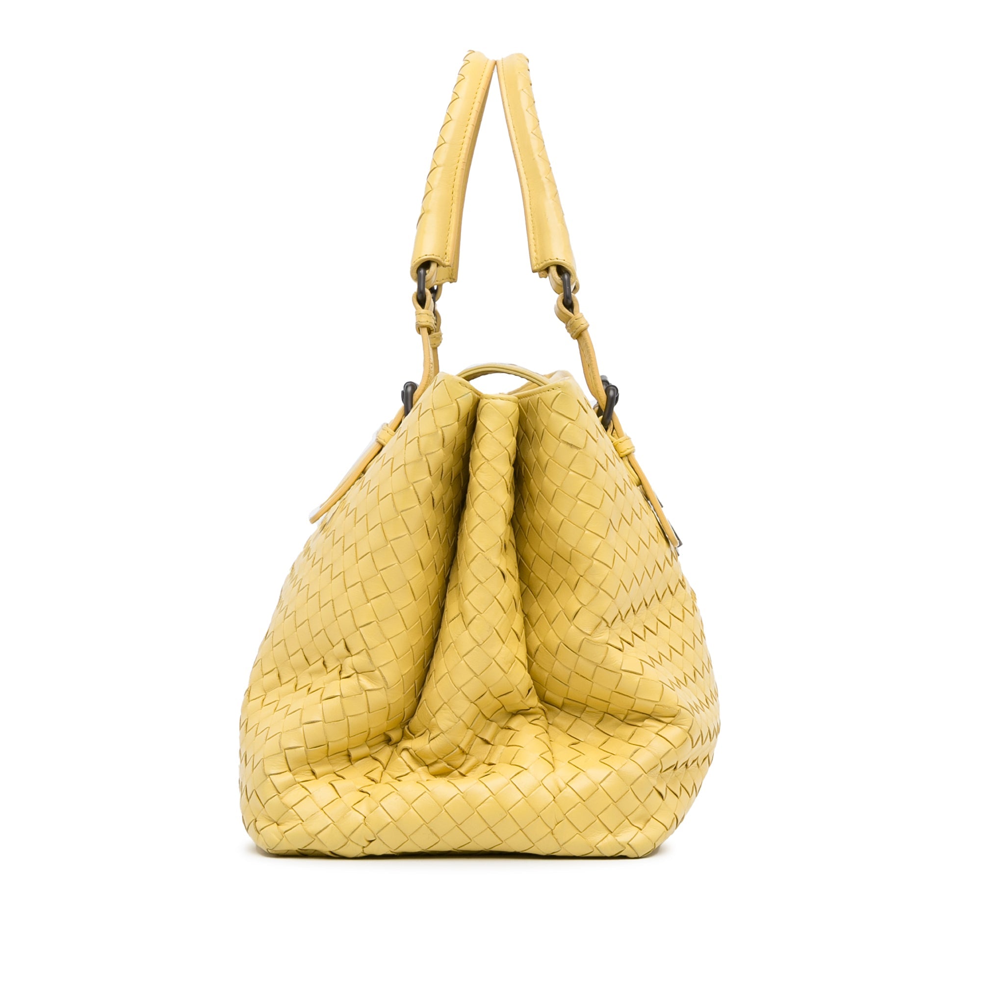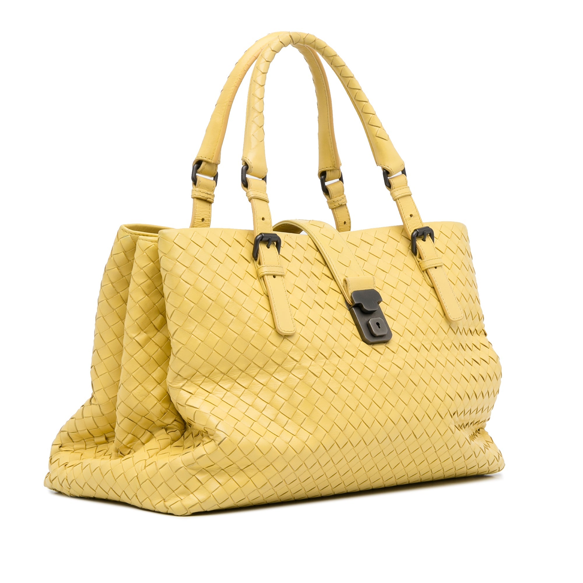 Product Details: Yellow Bottega Veneta Medium Intrecciato Roma Tote Bag. The Roma features a woven leather body, rolled handles, a top strap with a push lock and magnetic closure, interior compartments, and an interior zip pocket. 9.8″ L x 14.6″ W x 6.7″ D, 7.9″ drop. Serial number B01585061K.