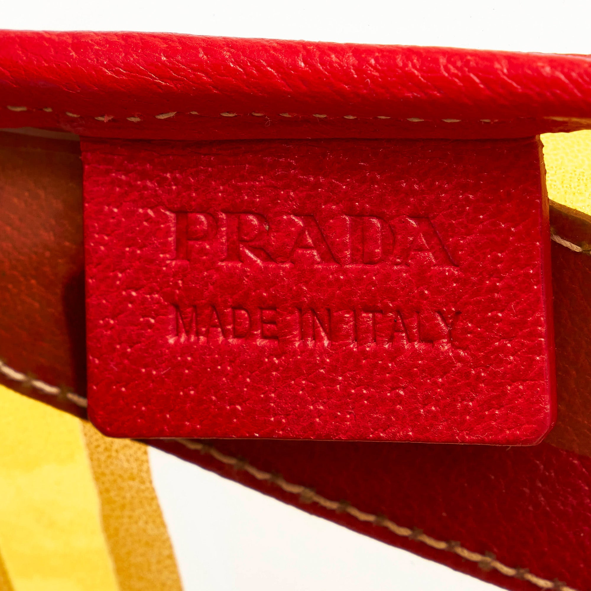 Product Details: Yellow Prada Printed Vinyl Tote Bag. This tote bag features a printed vinyl body with leather trim, rolled leather handles, and an open top. 9.1″ L x 16.3″ W x 3.9″ D, 7.5″ drop.